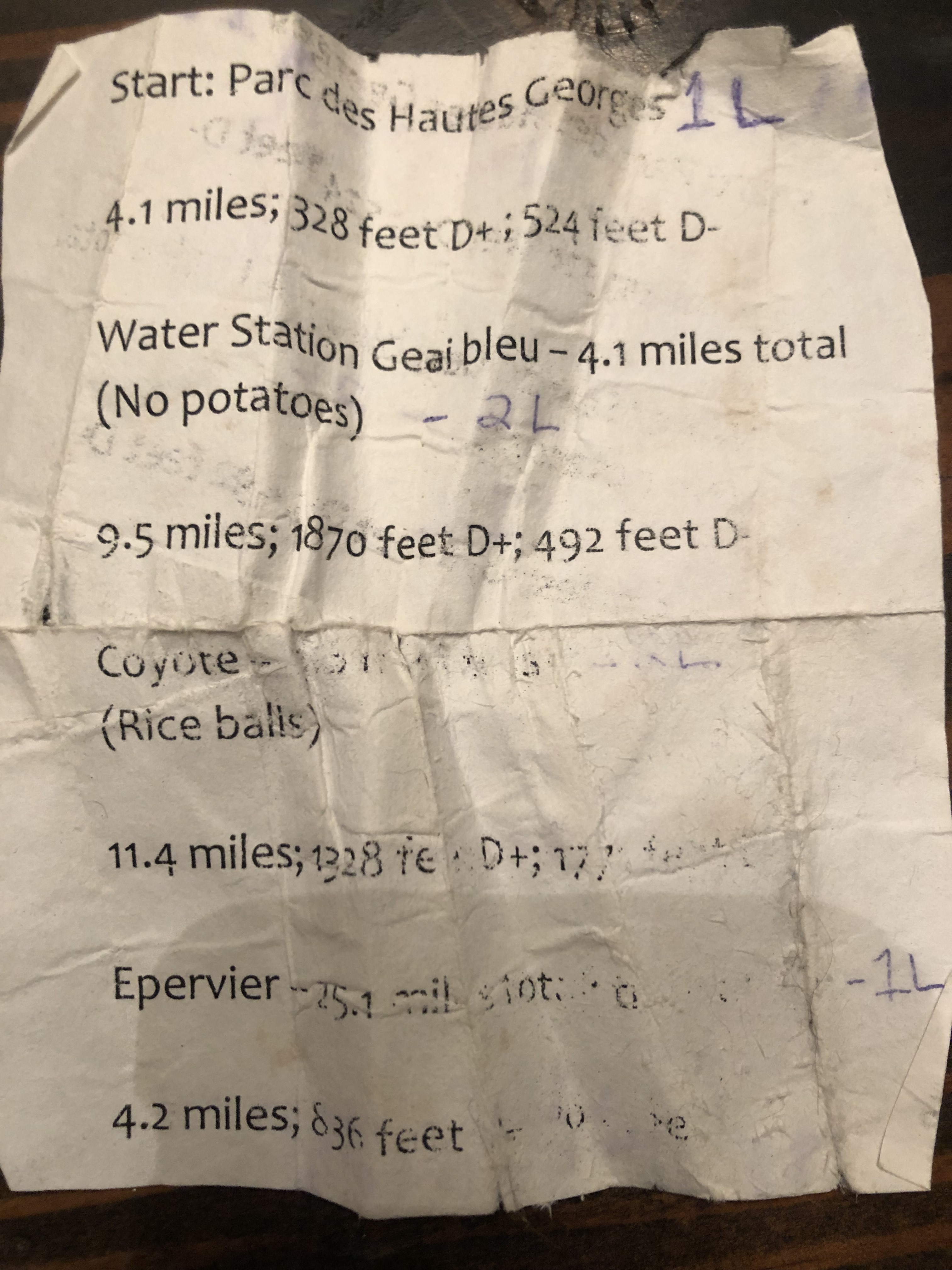 “4.1 miles to Water Station Geai Bleu,”